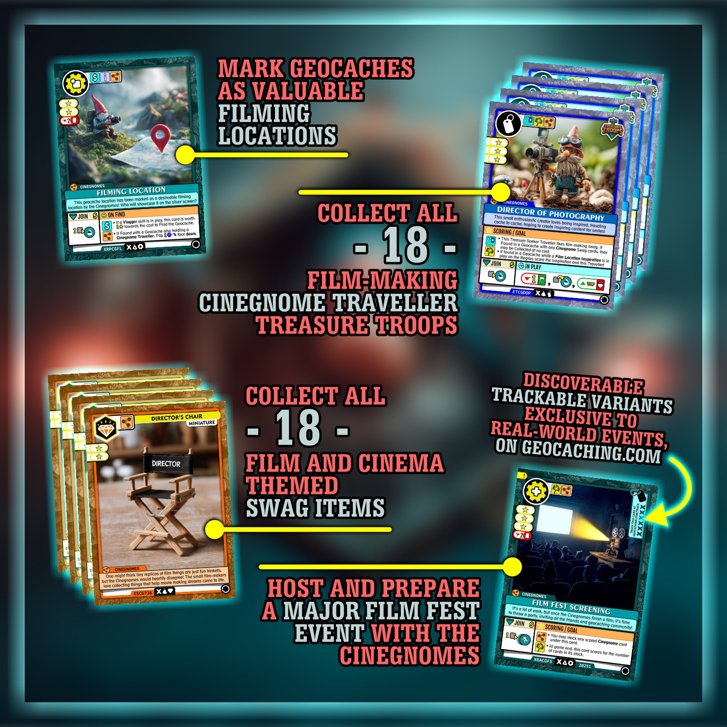 It's Film Festival season! The Treasure Troops latest corps - the Cinegnomes - are out in force to create and inspire through making geocaching films! At 18 strong, these film-makers are travelling the geocache landscape looking for valuable filming locations and experiences to share with the world. They love collecting film and cinema themed swag, and look forward to an exciting film festival screening event to round out the season!