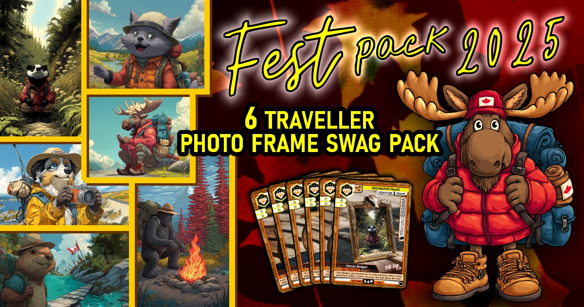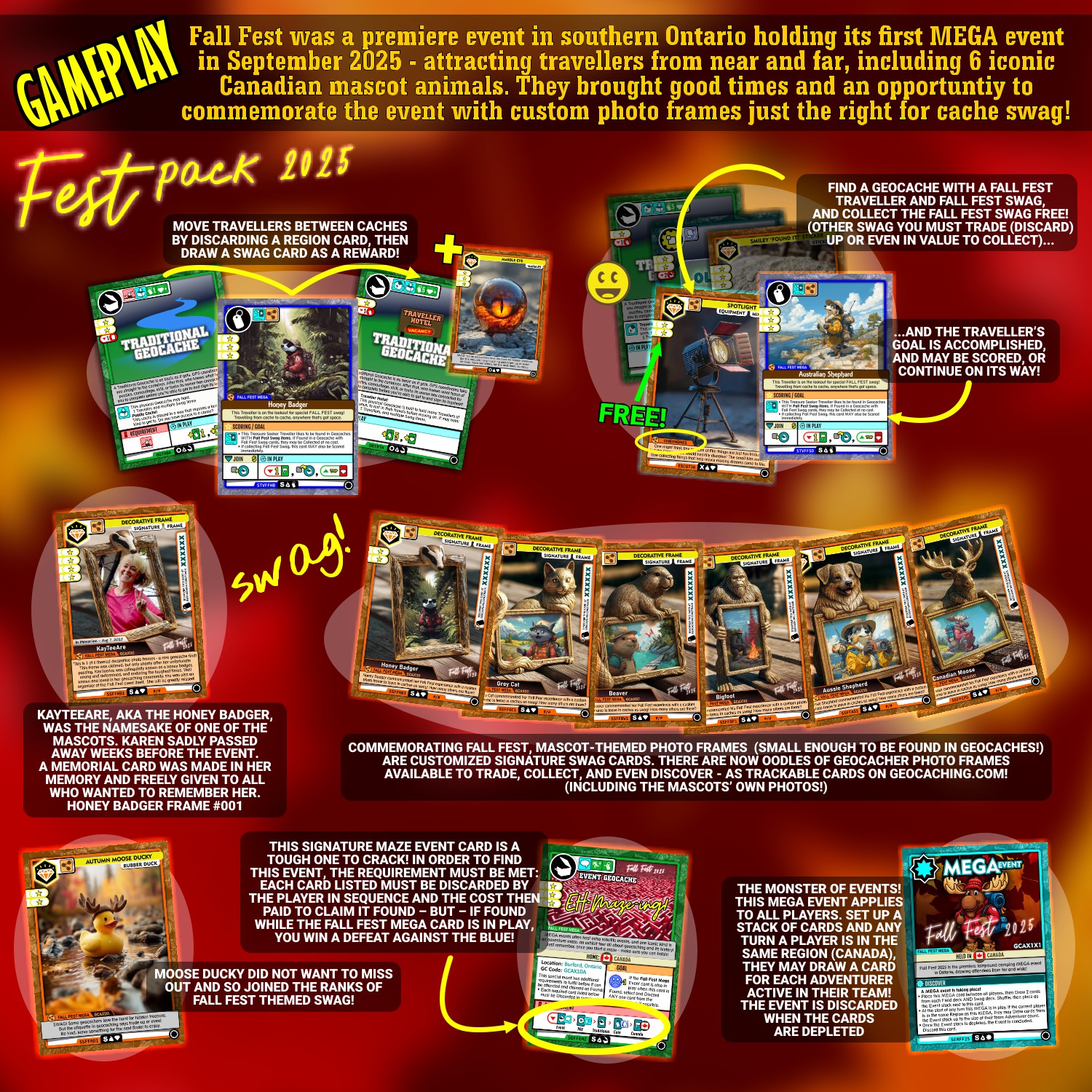 * You can also partner your Fall Fest traveller cards with Fall Fest SWAG cards! Photo frames you might find in geocaches are available in styles commemorative of each of the 6 mascots, and are discoverable on Geocaching.com. (Custom personalized signature photo frame ordering is now closed for 2025) (more here)