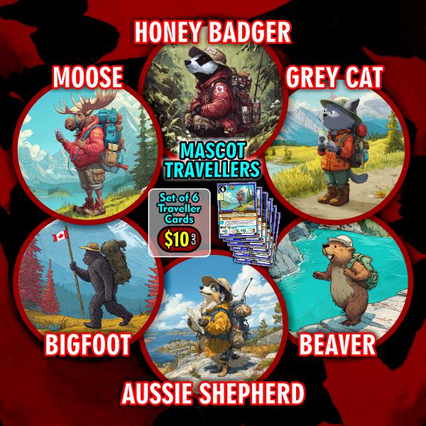This set of SIX Traveller game cards are signature cards of the event mascots - and they love to find other Fall Fest swag in Geocaches!