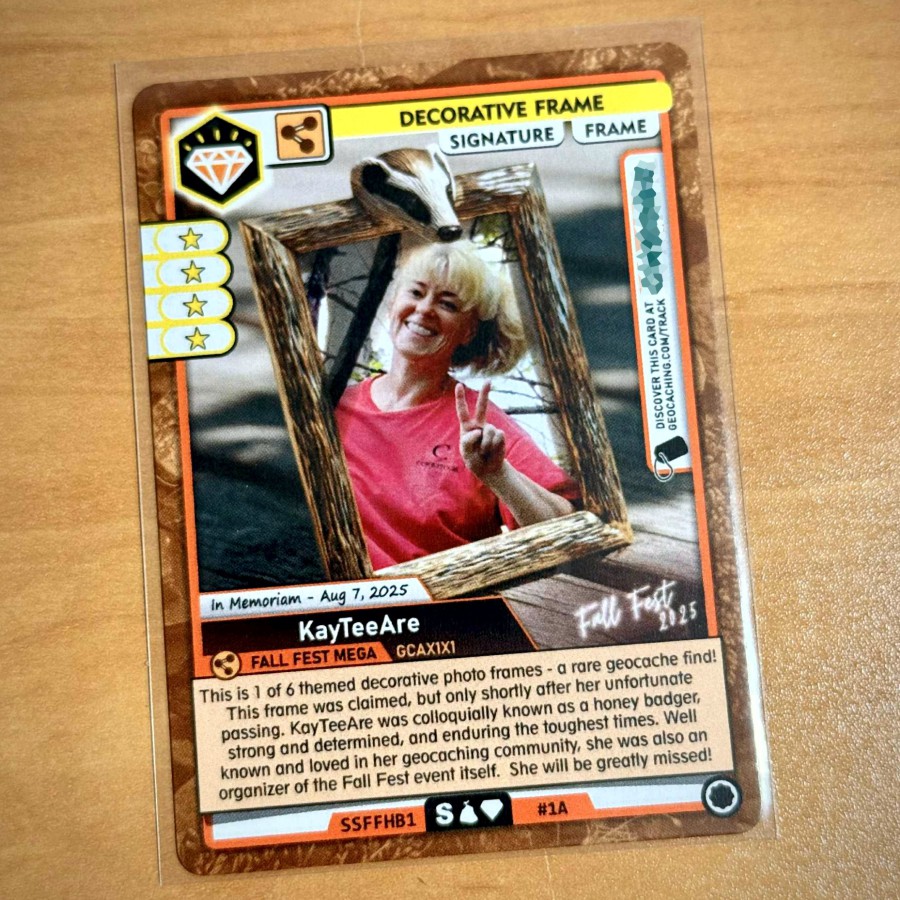 * Also offered at no additional cost, a memorial card commemorating local geocacher and Fall Fest organizer, the Honey Badger, kayteeare. Custom honey badger frame #1A.