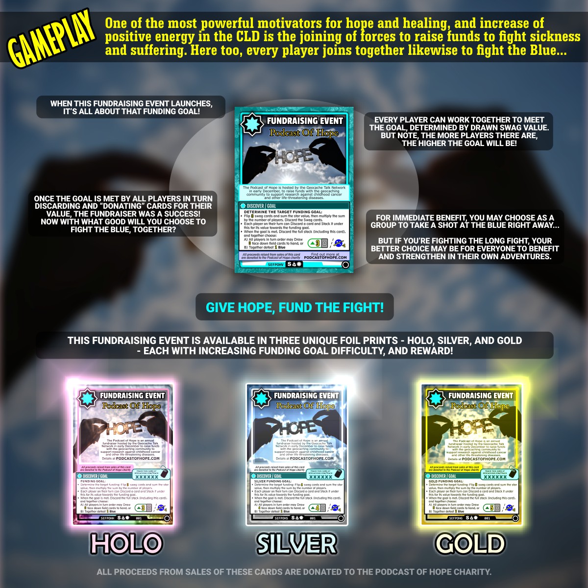 These are the first commemorative fundraiser cards in Cache Hunters, available in three variants as the FIRST foil-faced cards! The holo, silver, and gold variants increase in difficulty and reward. With a fundraiser card in play, every player works together to reach the shared goal, and once met, together you can choose to strengthen everyone's game, or fight back against the Blue directly!