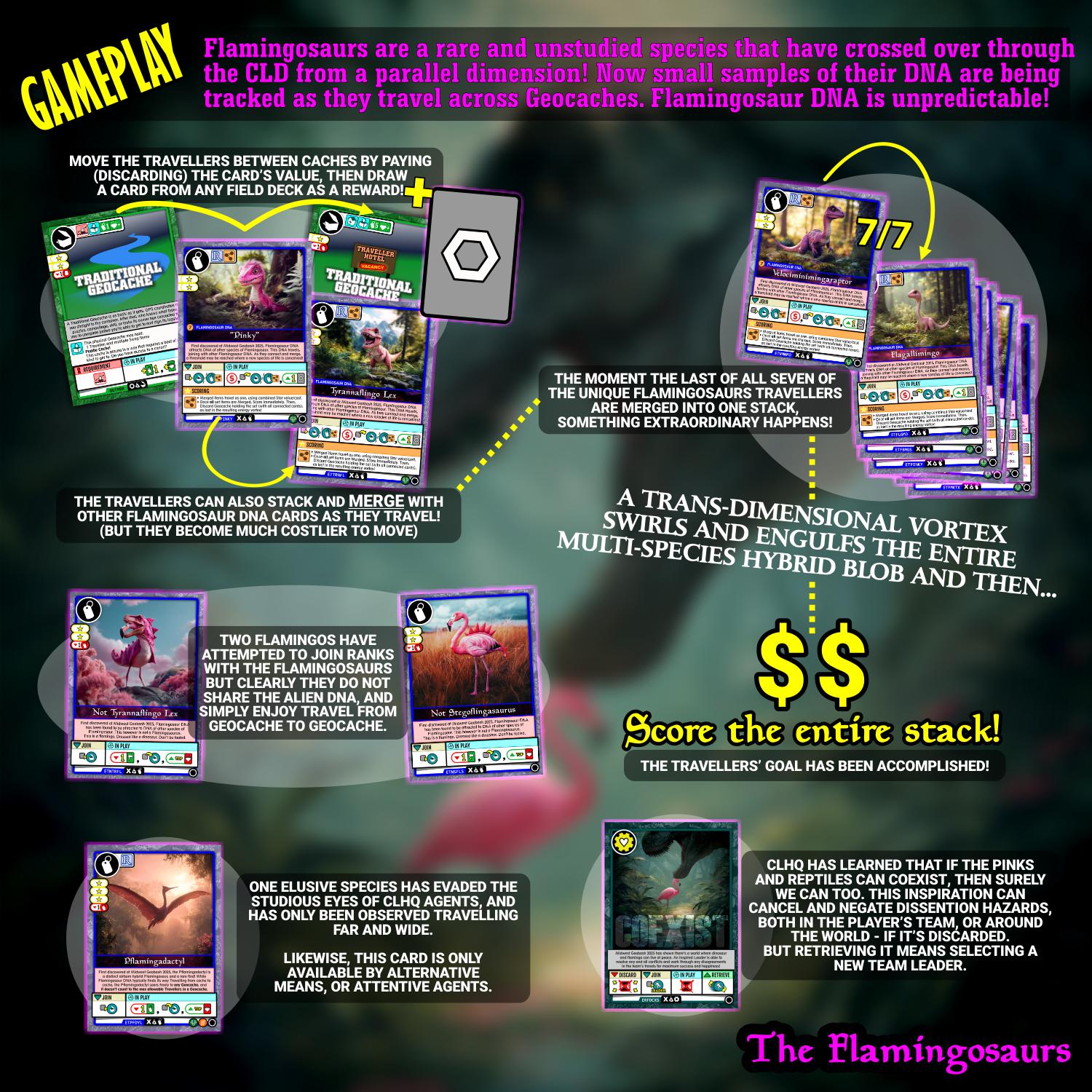 CLHQ tracks vials of Flamingosaur DNA as they travel from Geocache to Geocache. But the strange thing about these species DNA that originate from one of the alternate CLD dimensions is that they are attracted to each other. During play, the Travellers can move, but they can also stack and merge with each other. As soon as all 7 of the FlLamingosaur DNA cards are merged and travelling as one, it causes a major transdimensional vortex of CLD energy and emerging from the chaotic hurricane is -- something new, and 7 completed Traveller goals to score!